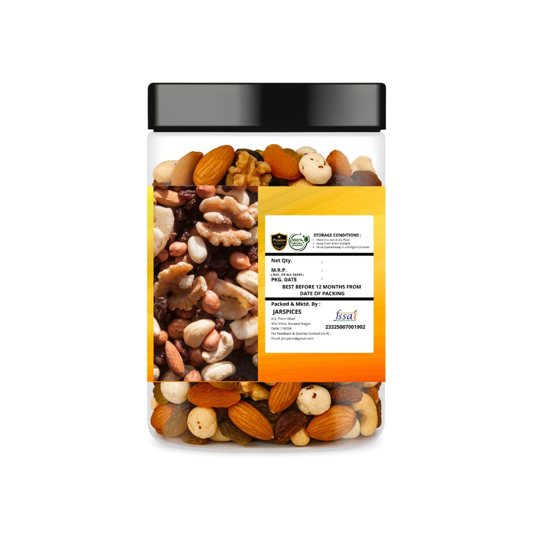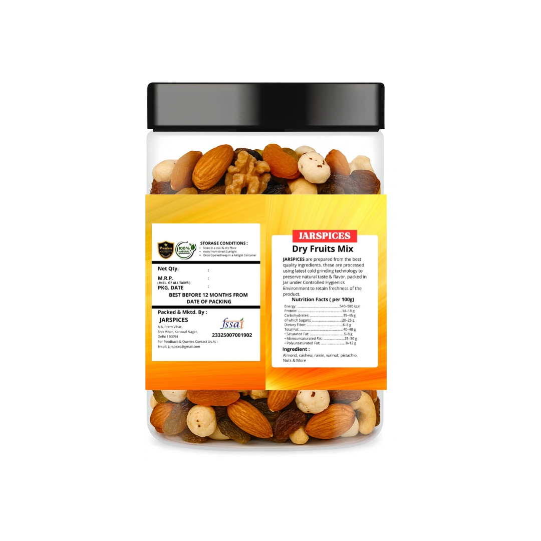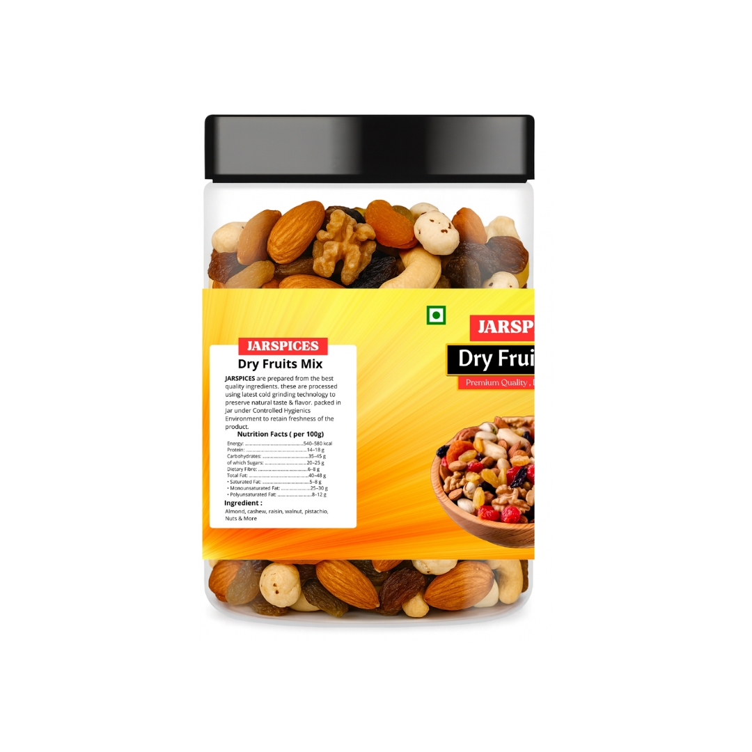 JarSpices Dry Fruits Mix carefully selected high-quality dry fruits ka balanced combination hai. Har ingredient freshness aur nutrition ko dhyan me rakh kar hygienically processed aur packed kiya jata hai.
